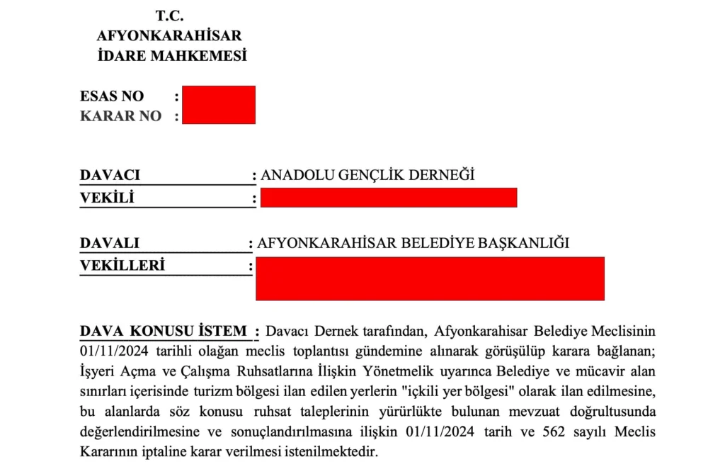 Afyonkarahisar’da kamuoyunu derinden sarsan ve “içkili yer bölgesi” ilanı üzerinden başlayan tartışma yargıya takıldı. Belediye Meclisi’nin 1 Kasım 2024’te aldığı karar, Afyonkarahisar İdare Mahkemesi tarafından hukuka aykırı bulundu ve oybirliğiyle iptal edildi.