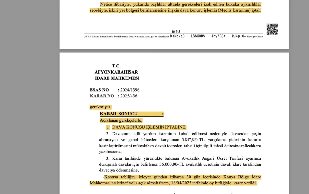 Afyonkarahisar İdare Mahkemesi’nin 18 Nisan 2025 tarihinde oybirliğiyle aldığı iptal kararı, 20 Mayıs 2025’te taraflara tebliğ edildi. Karar kesinleşirse, verilen içki ruhsatları da geçersiz hale gelecek ve geri dönüş mümkün olmayacak. Ancak Belediye, karara karşı 30 gün içinde Konya Bölge İdare Mahkemesi’ne başvurabilir.
