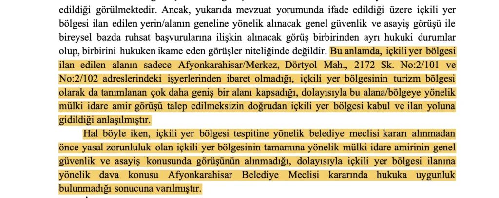 Belediye Meclisi kararında “turizm bölgesi” ifadesiyle içkili alanlar tanımlanmış ancak tasdikli bir kroki ya da açık adres bilgisi sunulmamıştı. Mahkeme, bu belirsizliğin hem vatandaşların hukuki güvenliğini ihlal ettiğini hem de uygulamada kaosa yol açacağını vurguladı.