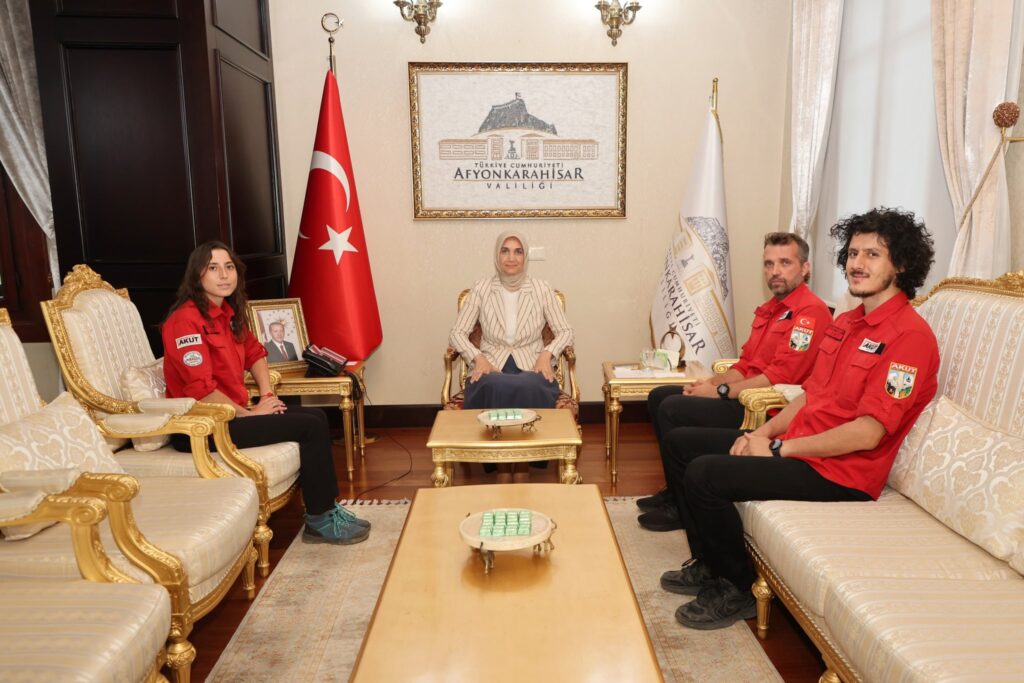 Afyonkarahisar Valisi Doç. Dr. Kübra Güran Yiğitbaşı, AKUT Afyonkarahisar Ekibi Karar Grup üyeleri Süleyman Emre Millik, Melih Özsandık ve ekip gönüllüsü Ayşe Nur Kaya Millik’i makamında kabul etti. Görüşmede, arama kurtarma çalışmalarında gönüllülüğün önemi, afetlere hazırlık sürecinde yerel ve ulusal iş birliklerinin güçlendirilmesi ile AKUT’un bölgede yürüttüğü faaliyetler masaya yatırıldı.