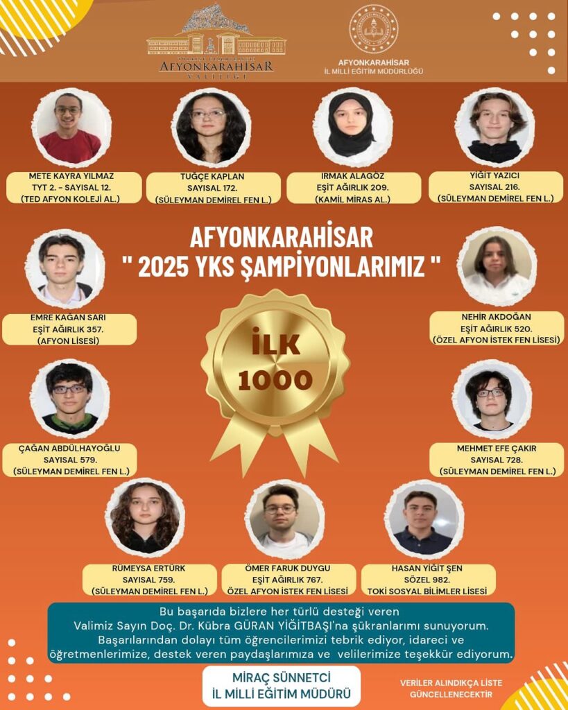 “Afyonkarahisar’ımızdan, 2025 YKS’de Türkiye genelinde ilk 1000’e girerek hepimizi gururlandıran sevgili öğrencilerimizi yürekten tebrik ediyorum. Bu büyük başarıda emeği geçen başta İl Milli Eğitim Müdürümüz ve tüm gayretli idarecilerimize, fedakâr öğretmenlerimize ve her daim evlatlarının arkasında duran değerli ailelerine teşekkür ediyorum.”