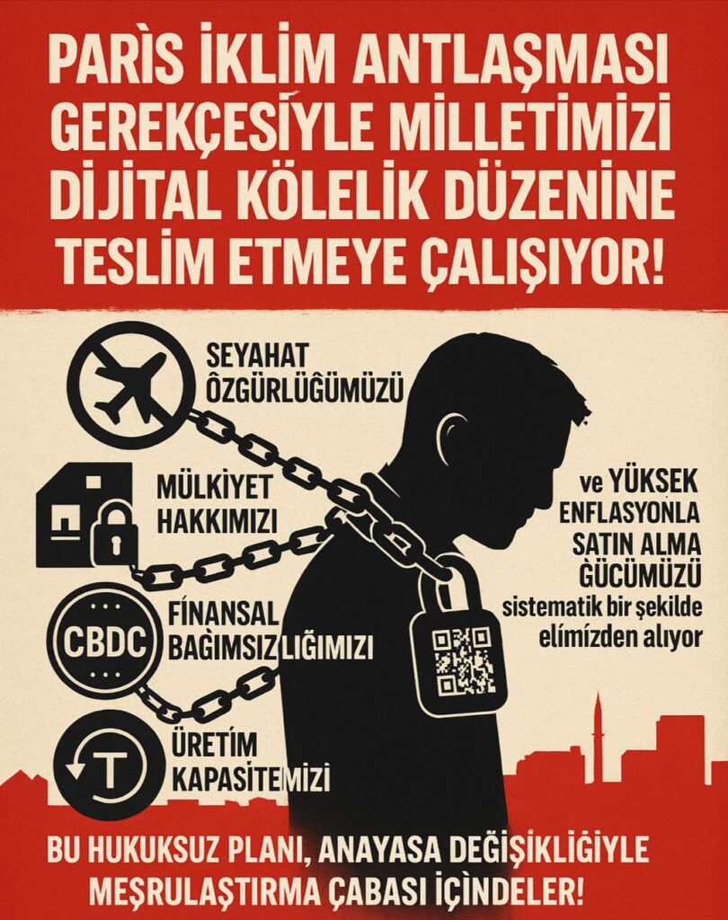 Güçlü Parti Genel Başkanı Osman Ünsal, Paris İklim Antlaşması’nı gerekçe göstererek hükümetin halkı dijital bir kölelik düzenine sürüklemeye çalıştığını öne sürdü. Sosyal medya üzerinden yaptığı açıklamada Ünsal, anayasa değişikliğiyle meşrulaştırılmak istenen bu düzenin; mülkiyet, seyahat, üretim ve finansal özgürlükleri ciddi şekilde tehdit ettiğini belirtti.