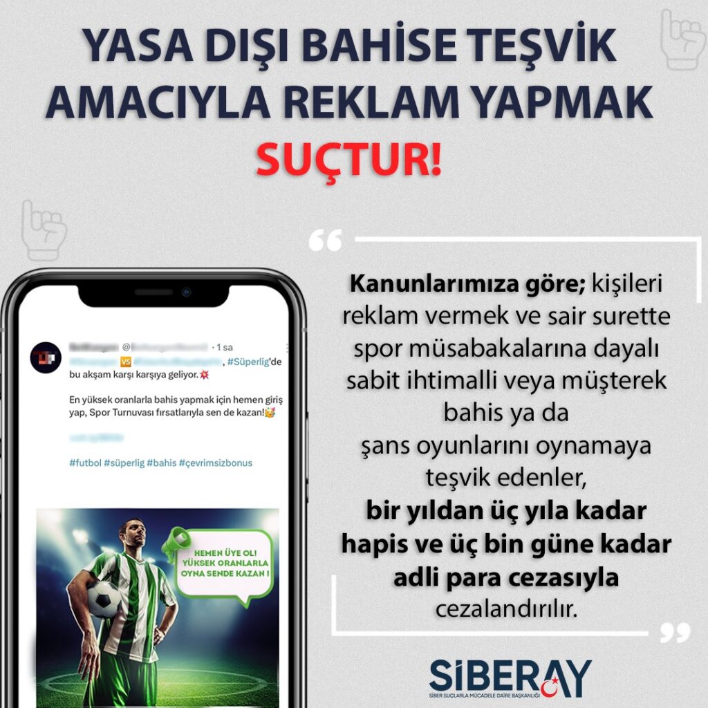 Afyonkarahisar Emniyet Müdürlüğü, yasa dışı yollarla bahis oynatılmasının, oynanmasına yer ve imkan sağlanmasının, teşvik edilmesinin veya aracılık yapılmasının suç teşkil ettiğini vurguladı. Emniyet, “Yasa dışı bahis oynamayın, suça ortak olmayın” diyerek vatandaşları bu tür faaliyetlerden uzak durmaya çağırdı.
