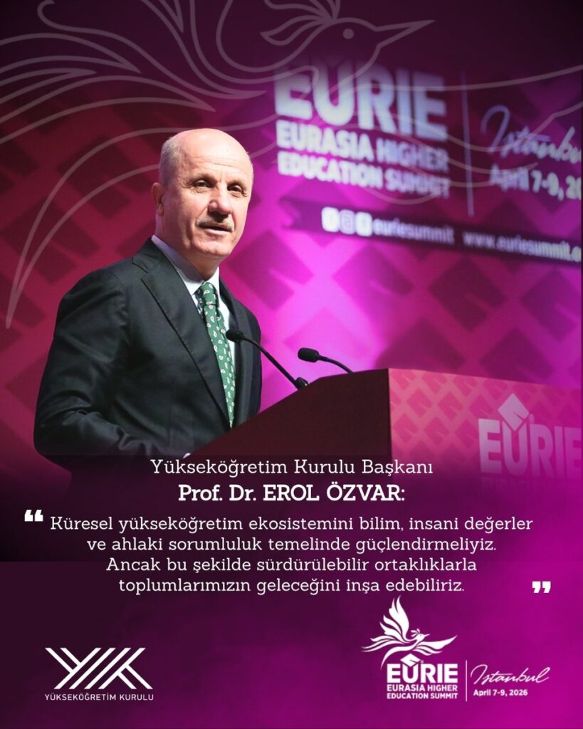 Yükseköğretim Kurulu (YÖK) Başkanı Erol Özvar, Avrasya Üniversiteler Birliği (EURAS) tarafından bu yıl 11’incisi düzenlenen Avrasya Yükseköğretim Zirvesi (EURIE 2026) kapsamında, Türkiye’nin yükseköğretime ilişkin yeni dönem vizyonunu uluslararası akademik kamuoyuyla paylaştı.