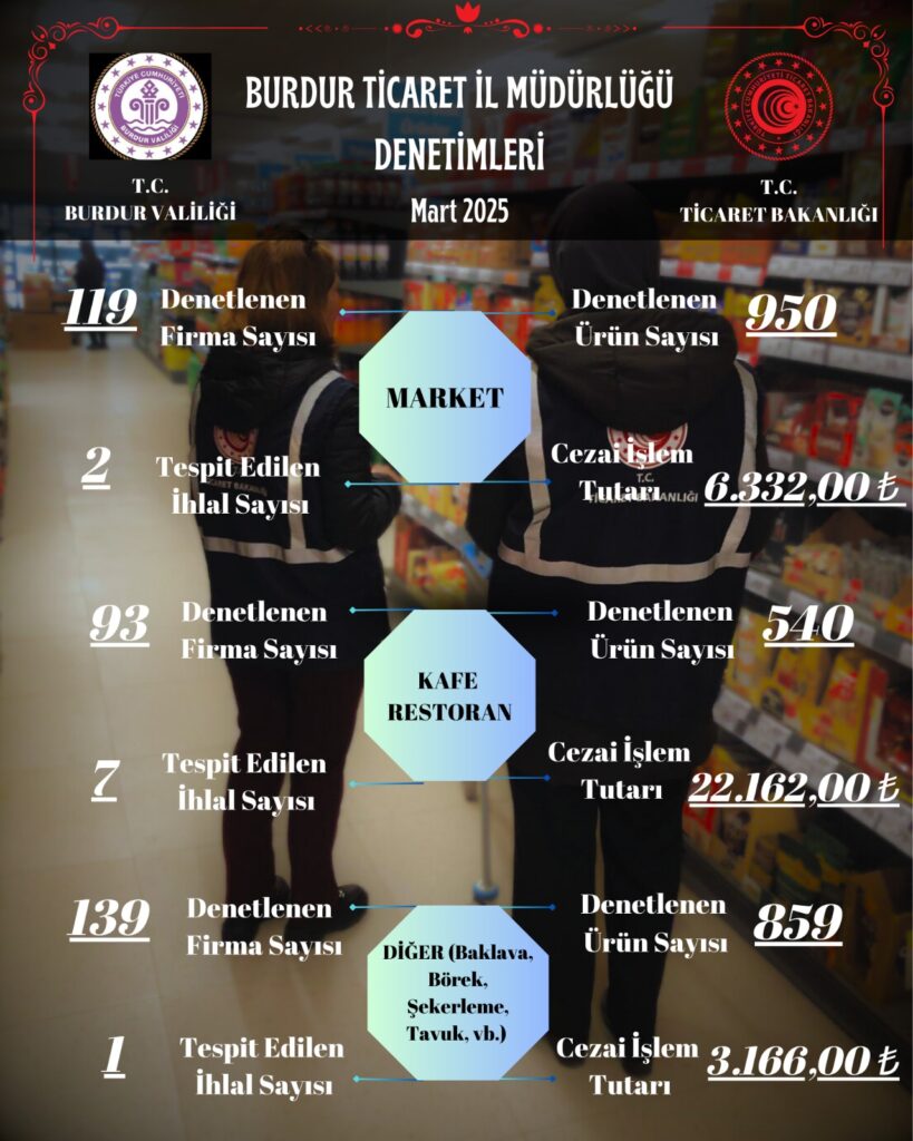 Mart 2025 döneminde 351 Firma 2349 ürün denetimi gerçekleştirildi, 10 firmaya 31.660.00 TL idari para cezası uygulandı. (Market, kafe, lokanta, Pazar yeri, fırın, kuaför vb.)