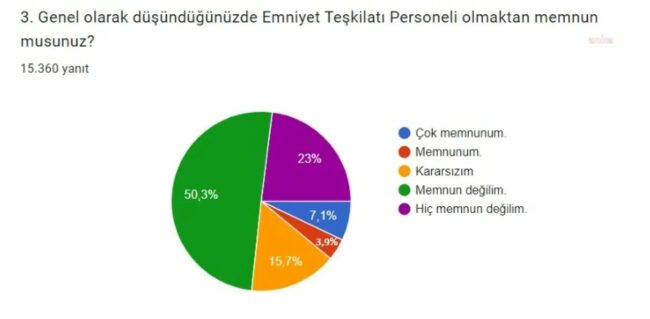 Memnuniyetsizlik oranları da dikkat çekti. “Emniyet teşkilatı personeli olmaktan memnun musunuz”? sorusuna Ankete katılan emniyet mensuplarının yüzde 23 ‘hiç memnun değilim’, yüzde 50,3 ‘memnun değilim’, yüzde 3,9 ‘memnunum’, yüzde 7,1 ise ‘çok memnunum’ cevabını verdi. Kararsız kalanların oranı ise yüzde 15,7 oldu