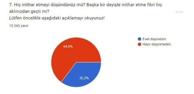 Ankete göre, her 10 polisten 3’ü intihar etmeyi düşündüğünü belirtirken, intihar nedenleri arasında en önde gelen sebep “mobbing” olarak öne çıktı. “Hiç intihar etmeyi düşündünüz mü?” sorusuna emniyet mensuplarının yüzde 64,8″i ‘hayır’ cevabını verirken, intihar etmeyi düşünenlerin oranı ise yüzde 35,2 oldu.
