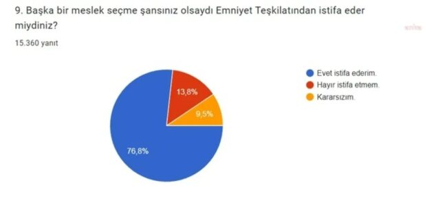 Emniyet Teşkilatı personelinin yüzde 76,8’i başka bir meslek seçme şansı olsa istifa edeceğini belirtirken, ‘Hayır istifa etmem’ diyenlerin oranı yüzde 13,8 oldu. Kararsızların oranı ise yüzde 9,5 olarak açıklandı.