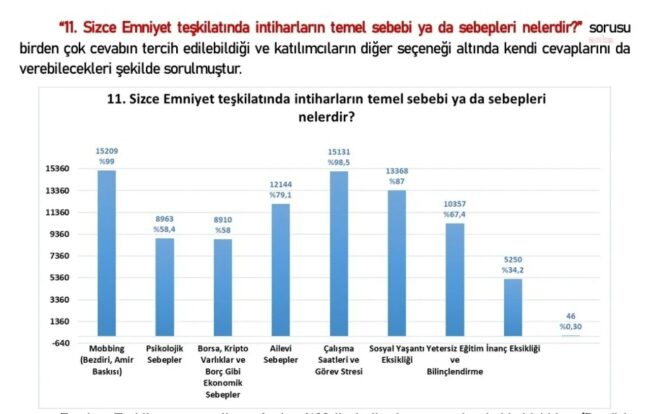 Araştırmaya göre, Emniyet Teşkilatı personelinin intiharların temel sebebi olarak ilk sırada yüzde 99 oran ile “mobbing (bezdiri, amir baskısı)”, ikinci sırada ise yüzde 98,5 ile “çalışma saatleri ve görev stresi” yer aldı.