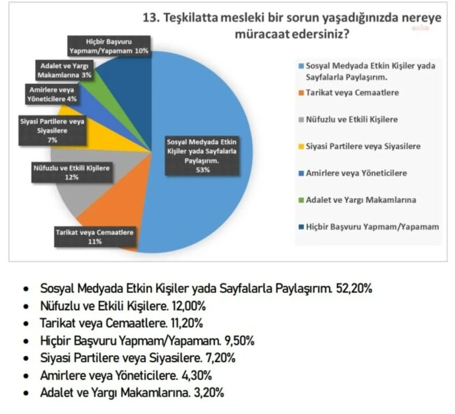 Ankette dikkat çeken bir başka nokta ise, “Teşkilatta mesleki bir sorun yaşadığınızda nereye müracaat edersiniz?” sorusuna ankete katılanların yüzde 52.20’si “Sosyal medyada etkin kişiler yada sayfalarla paylaşırım”, yüzde 12’si “Nüfuzlu ve etkili kişilere”, yüzde 11,20’si “Tarikat veya cemaatlere”, yüzde 7,20’si “Siyasi partilere veya siyasilere”, yüzde 4,30’u “Amir veya yöneticilere”, yüzde 3,2’si “Adalet ve yargı makamlarına” müracaat edeceği cevabını verdi. “Hiçbir başvuru yapmam” diyenlerin oranı yüzde 9,5 oldu.