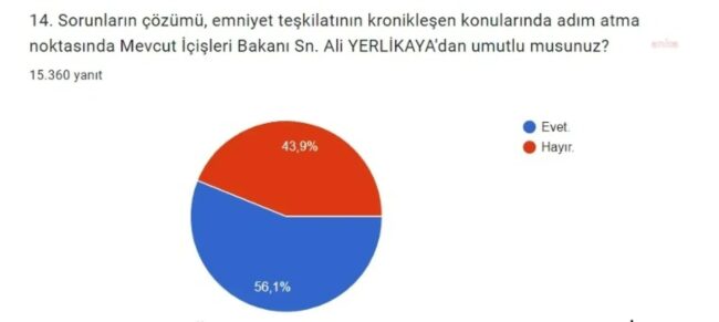 İçişleri Bakanı Ali Yerlikaya’ya duyulan güven de ankette ele alınan bir konuydu. “Sorunların çözümü, Emniyet Teşkilatı’nın kronikleşen konularında adım atma noktasında mevcut İçişleri Bakanı Ali Yerlikaya’dan umutlu musunuz?” sorusuna katılanların yüzde 56,1’i ‘umutlu’ olduğunu, yüzde 43,9’u ise ‘umutsuz’ olduğunu belirtti.