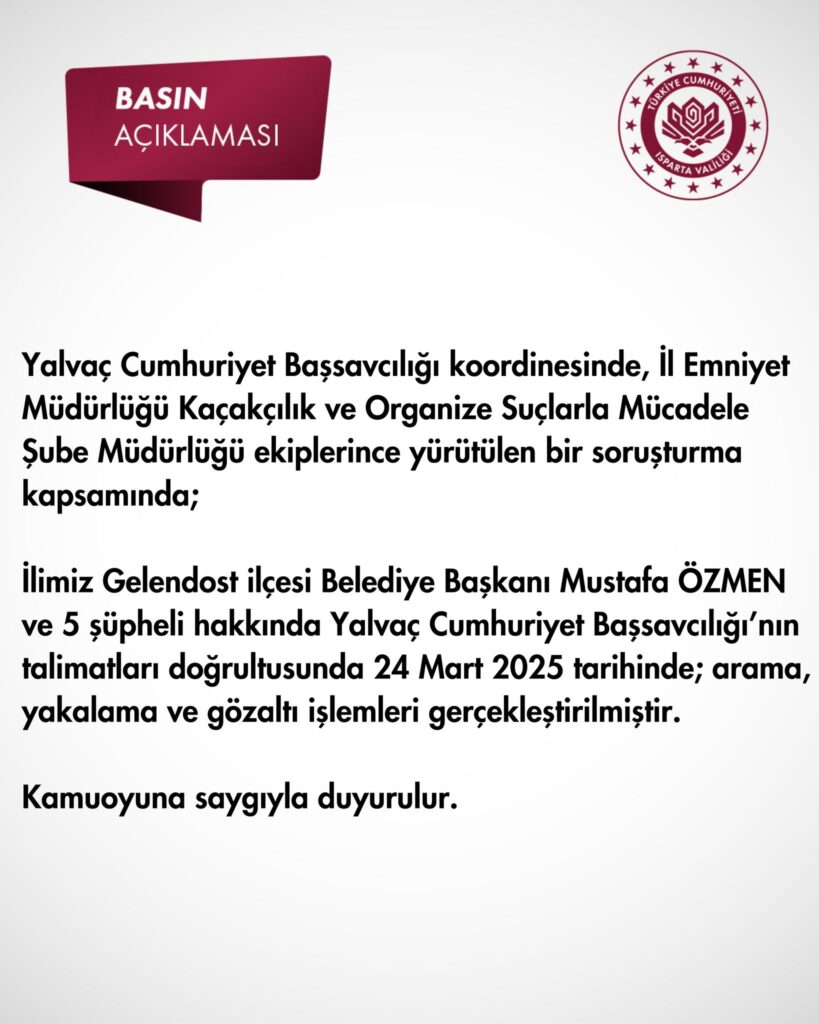 Isparta Valiliği tarafından yapılan açıklamaya göre, Yalvaç Cumhuriyet Başsavcılığı koordinesinde yürütülen bir soruşturma kapsamında, Gelendost Belediye Başkanı Mustafa Ozmen ve 5 şüpheli hakkında adli işlem gerçekleştirildi.