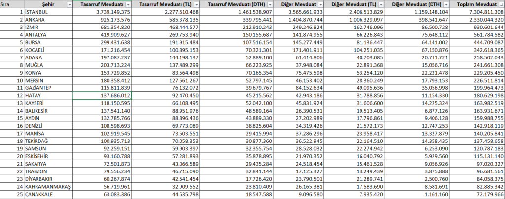 Türkiye’nin ekonomik merkezi konumundaki İstanbul, toplam mevduat miktarı bakımından diğer illeri geride bırakarak zirvede yer aldı. 7,30 trilyon TL’lik mevduat büyüklüğüne sahip olan İstanbul’u, 2,33 trilyon TL ile başkent Ankara takip ederken, İzmir ise 930 milyar TL ile üçüncü sırada yer aldı.