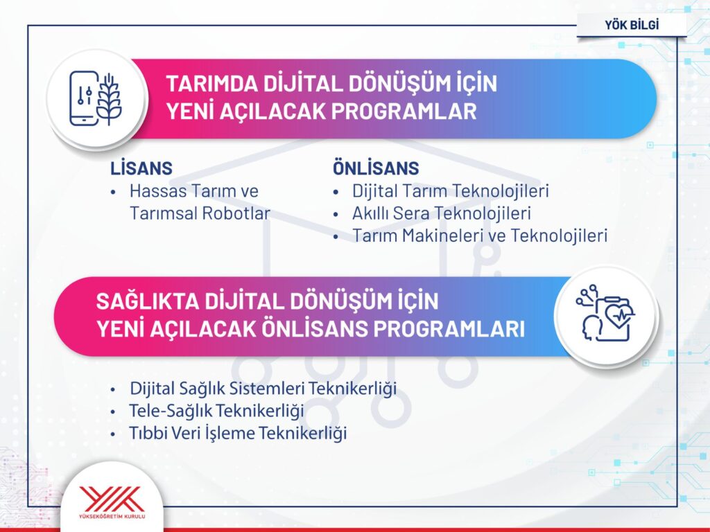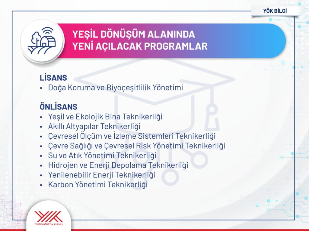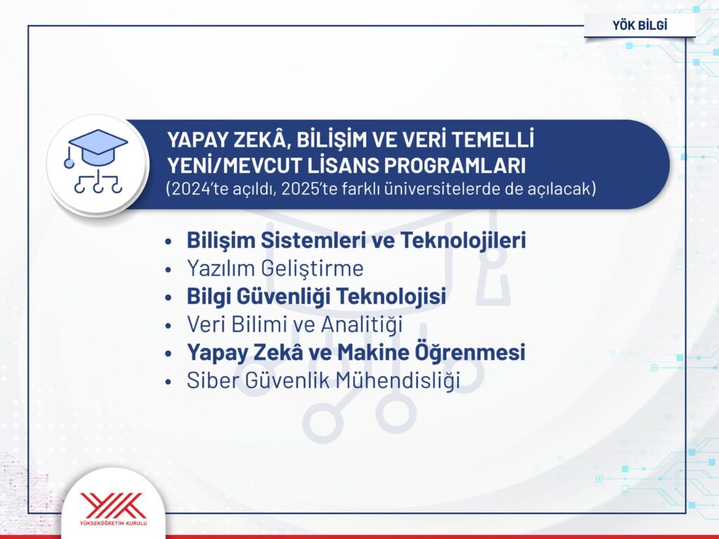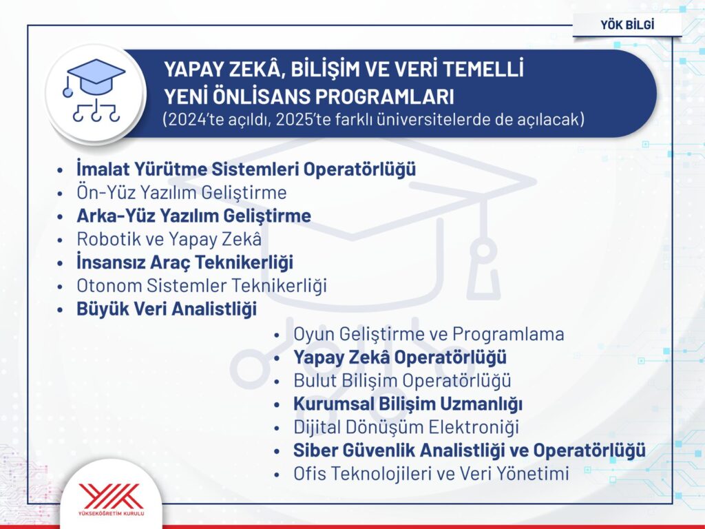 Prof. Dr. Özvar’ın açıklamasına göre, yapay zekâ alanında geçtiğimiz yıl başlatılan öncü programlar bu yıl itibarıyla daha da yaygınlaştırılacak. Bununla birlikte yeşil dönüşüme dayalı 9, sağlık ve tarımda dijital teknolojilere dayalı 7 olmak üzere toplam 16 yeni lisans ve ön lisans programı, 2025 YKS Tercih Kılavuzu’nda yer alacak.
